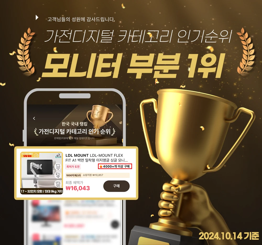 LDL-MOUNT FLEX FIT A1 벽면 밀착형 이지앵글 싱글 모니터암 17~32인치 까지 가능